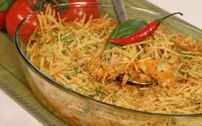 Cubra com a mussarela, espalhe por cima a batata palha e leve ao